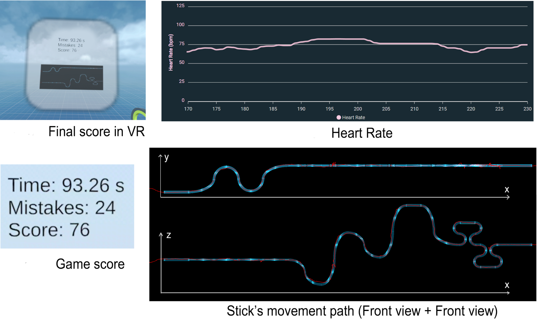 スティックがワイヤーに触れると警告音が鳴り、初期得点 100 点から 1 点が減点されます。触れ続けた場合は、1 秒ごとに追加で 1 点減点されます。コースを完走するとゲームが終了し、最終スコアとスティックの軌跡が表示されます。